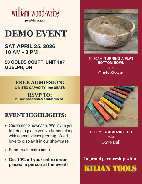 | Saturday, February 22nd-Sunday, February 23rd, 2025 | Class: Woodturning - Pens - An Introduction and More | Woodturning - Pens - An Introduction and More with Carl Durance at Intersections Wood Collaborative in Owen Sound, ON. The 2-day hands-on workshop provides a thorough introduction to the art of pen turning. For further information and registration on this course, see Woodturning - Pens - An Introduction and More on the Intersections Wood Collaborative website, or, email Intersections Wood Collaborative directly. Sample Pen Projects. |