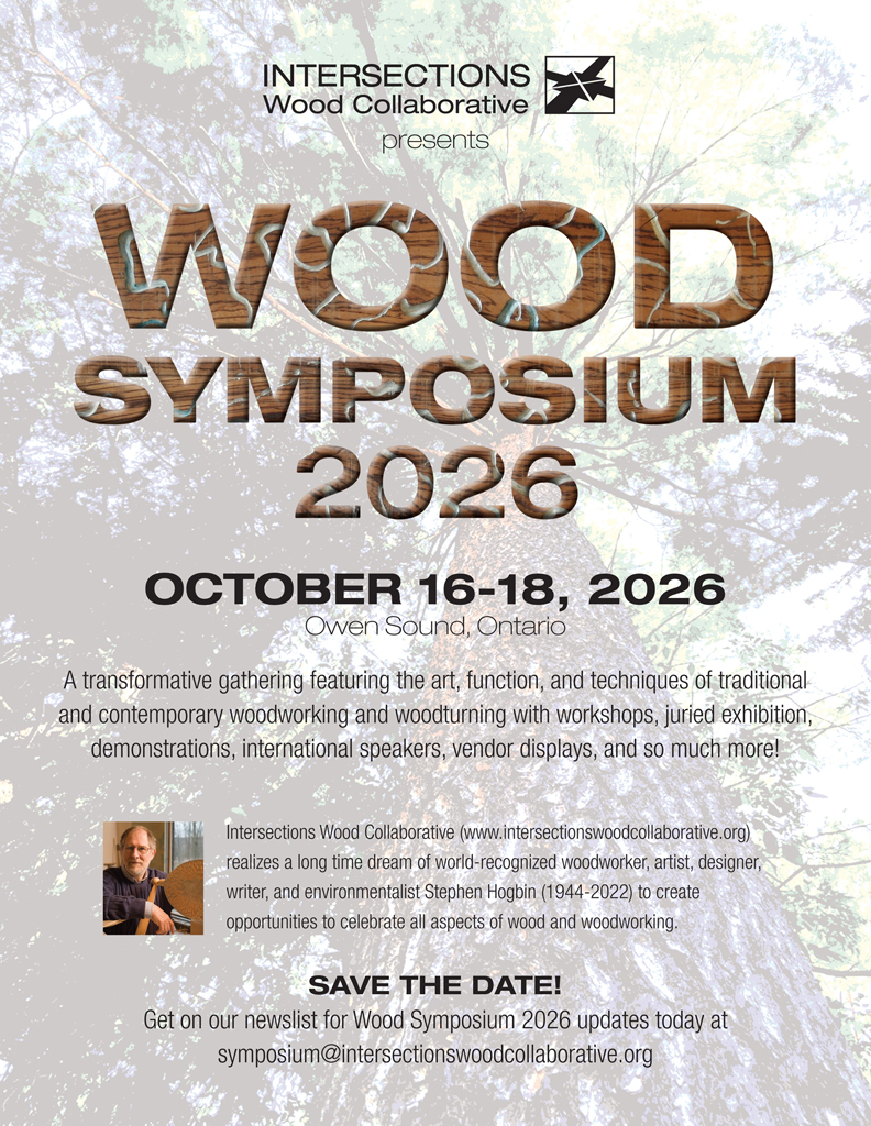| Friday, October 16th-Sunday, October 18th, 2026 | Intersections Wood Collaborative Wood Symposium 2026 | Intersections Wood Collaborative is actively planning to host its inaugural Wood Symposium including workshops, exhibition, demonstrations, presentations, and more, on October 16th-18th, 2026, in Owen Sound. To receive further information as it becomes available, email Intersections Wood Collaborative directly. |